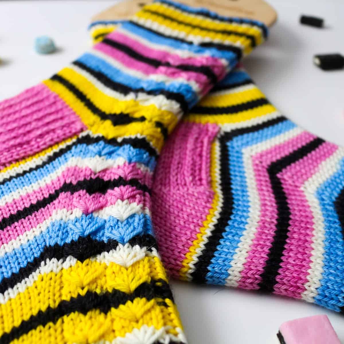 27 stitches by 36 rounds in stockinette = 4โ / 10 cm, after blocking. Gauge is crucial in obtaining the correct fit. Changes in gauge will result in a size difference for your finished socks.