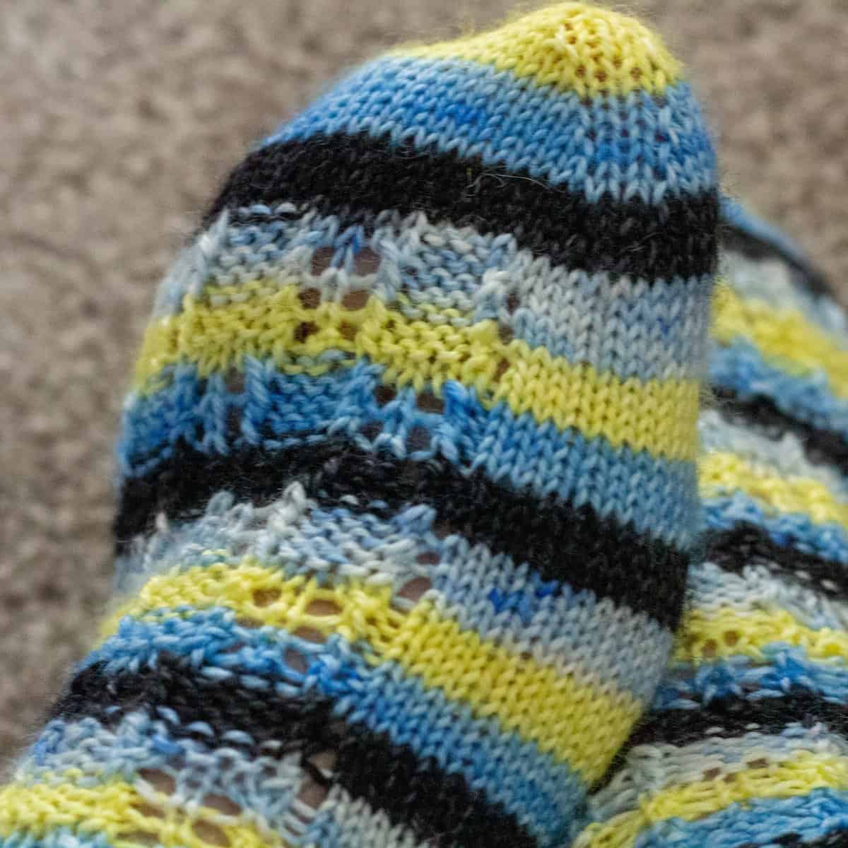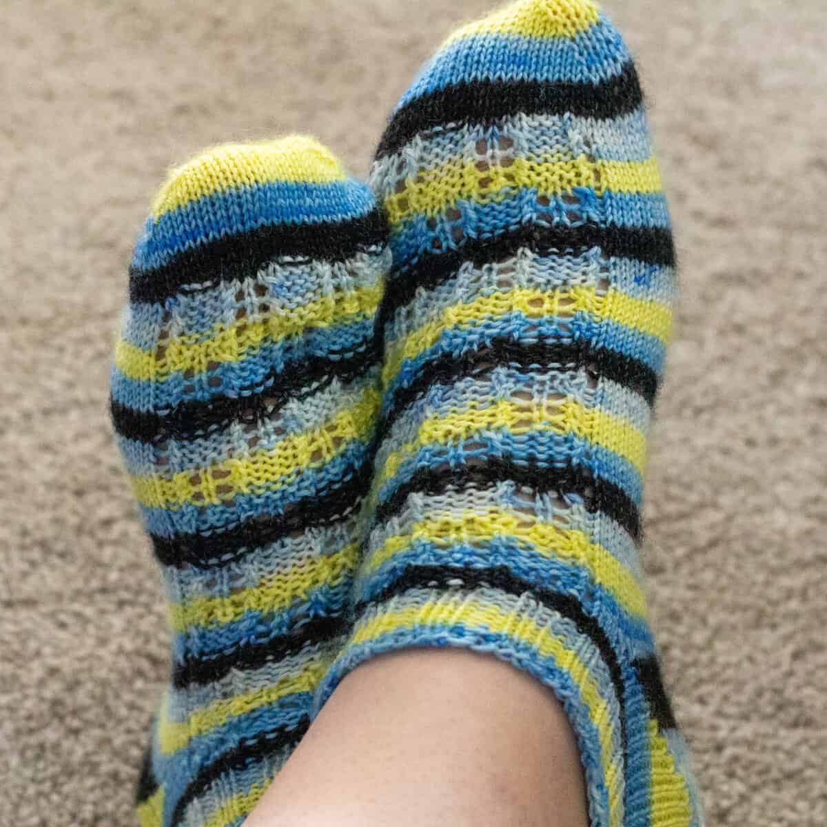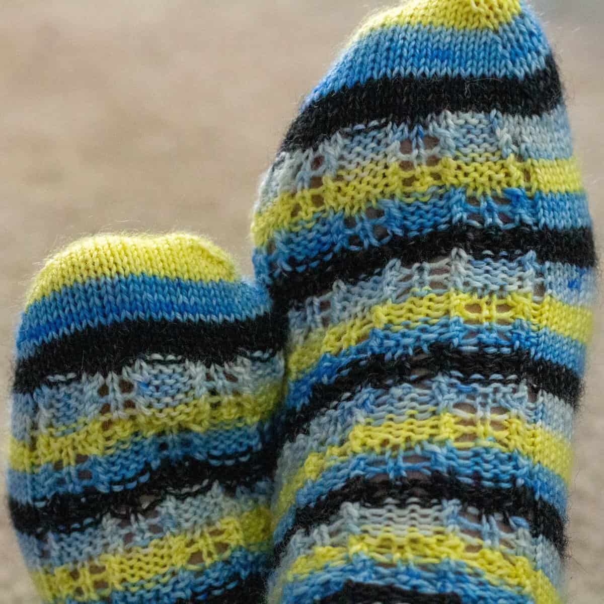 32 stitches by 40 rounds in stockinette = 4โ / 10 cm, after blocking. Gauge is crucial in obtaining the correct fit. Changes in gauge will cause a size difference for your finished socks.