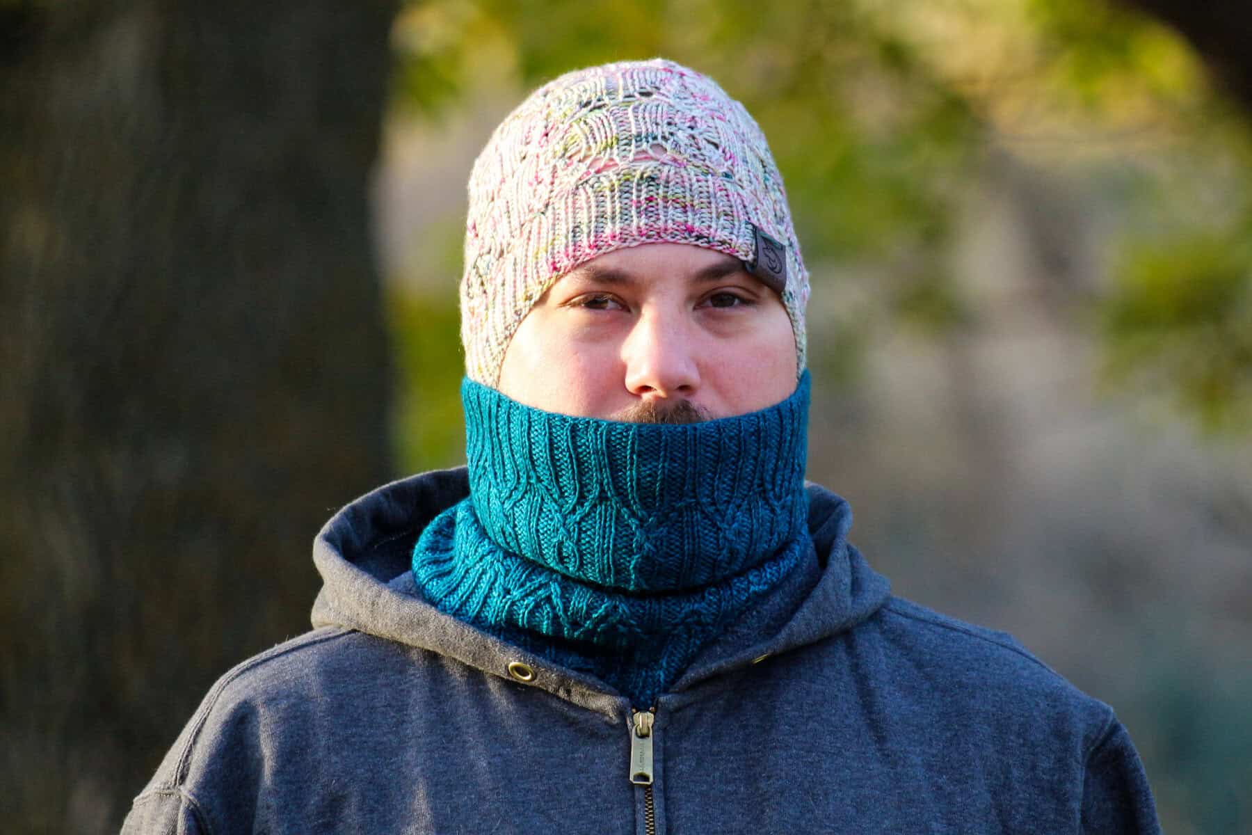 28 stitches by 34 rounds in pattern motif on larger needles = 4โ / 10 cm, after blocking. Gauge is crucial in obtaining the correct fit. Changes in gauge will cause a size difference for both your finished cowl and the yardage requirements for your project.