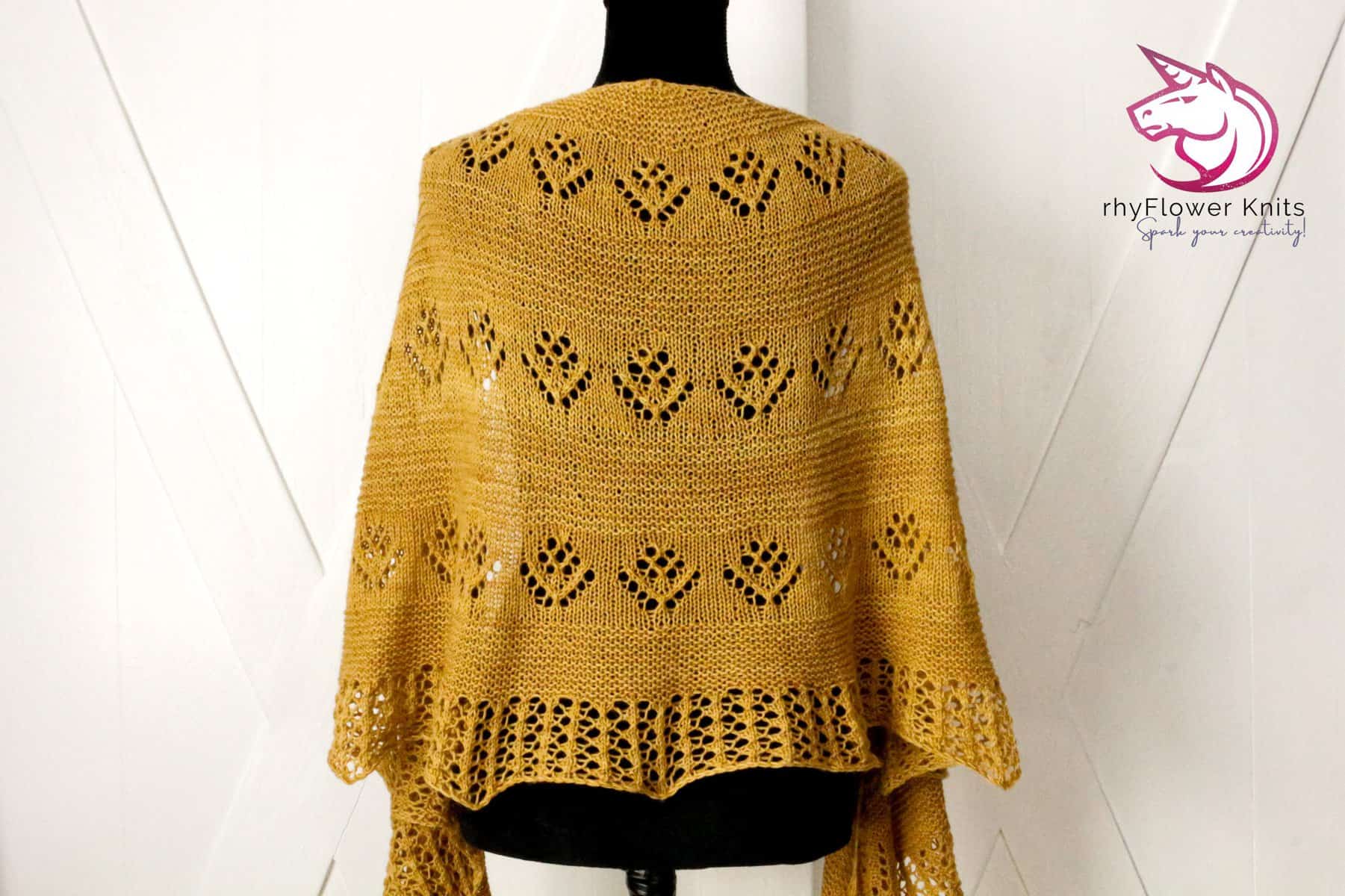 Approximately 66 [90, 114]โ / 168 [229, 290] cm across the wingspan, 16 [21, 27]โ / 41 [53, 69] cm deep, after blocking. Pattern sample is shown in the medium size.
