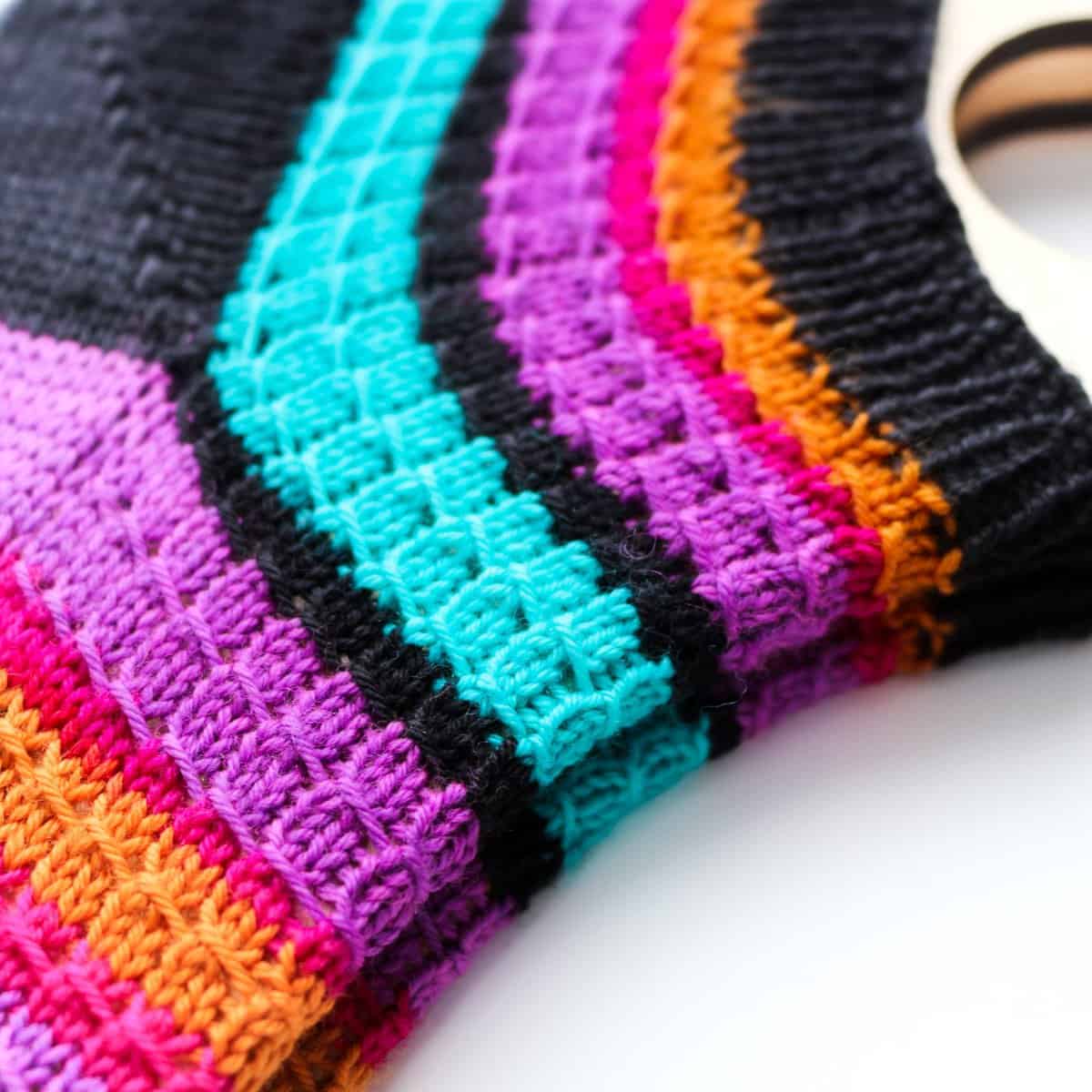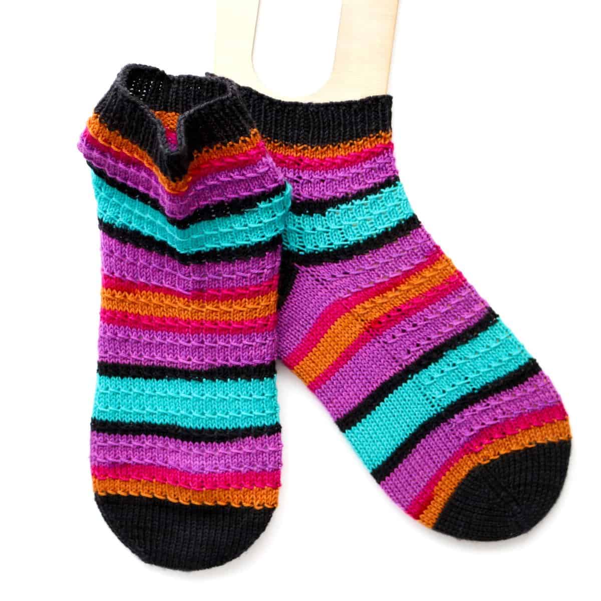 32 stitches by 40 rounds in stockinette = 4โ / 10 cm, after blocking. Gauge is crucial in obtaining the correct fit. Changes in gauge will result in a size difference for your finished socks.