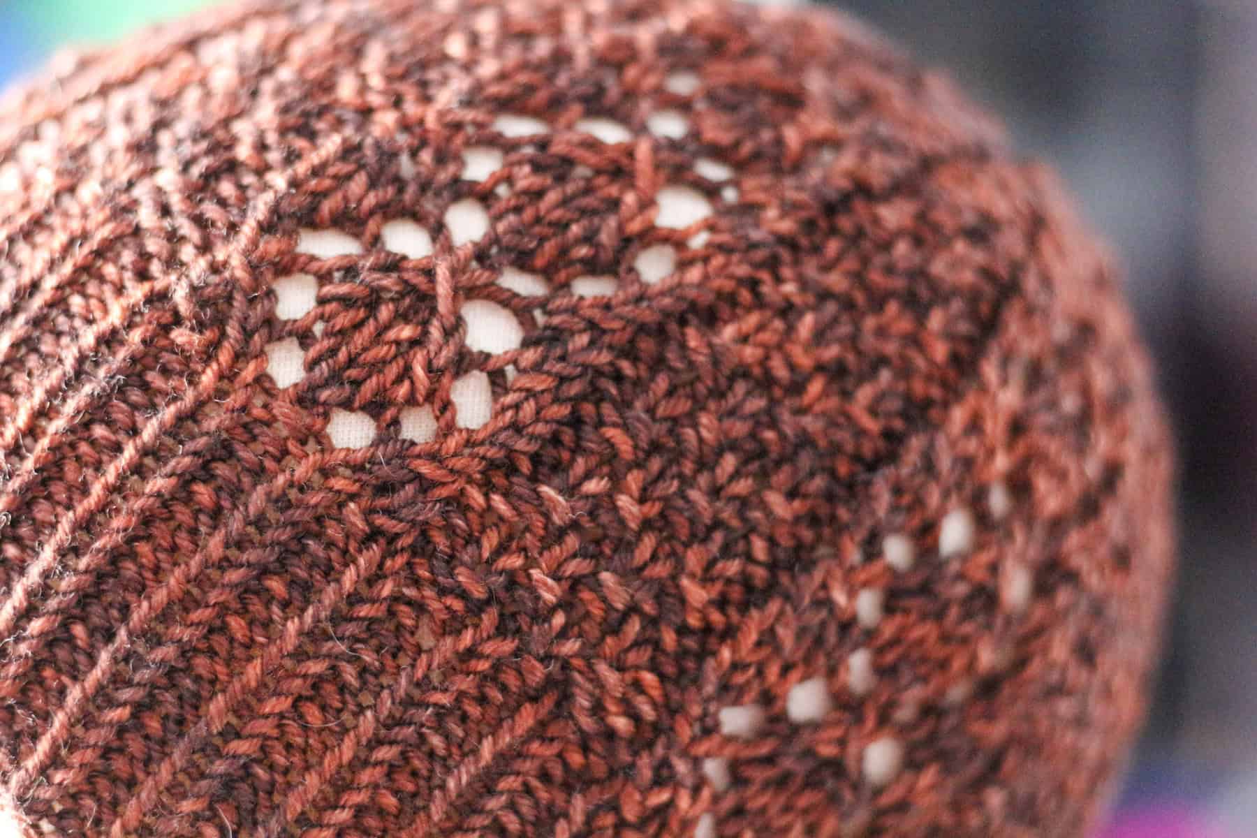18.5 stitches by 25 rounds in pattern motif on larger needles = 4โ / 10 cm, after blocking. Gauge is crucial in obtaining the correct fit. Changes in gauge will cause a size difference for both your finished hat and the yardage requirements for your project.