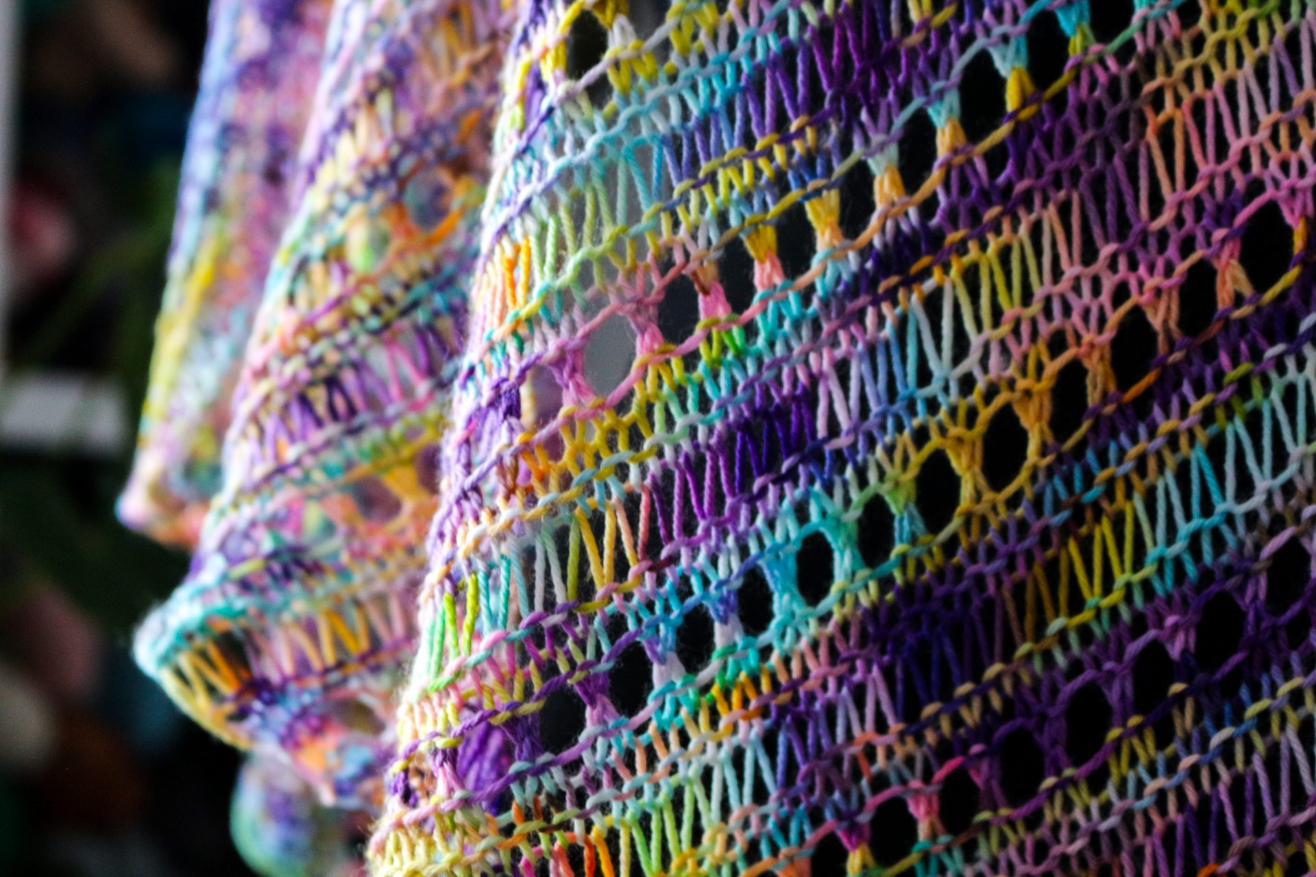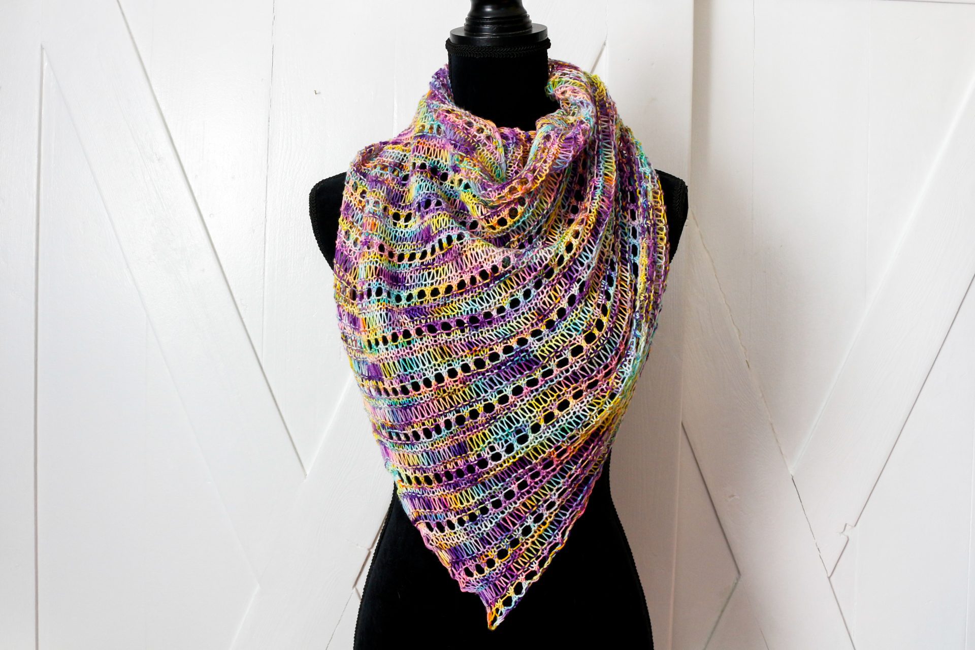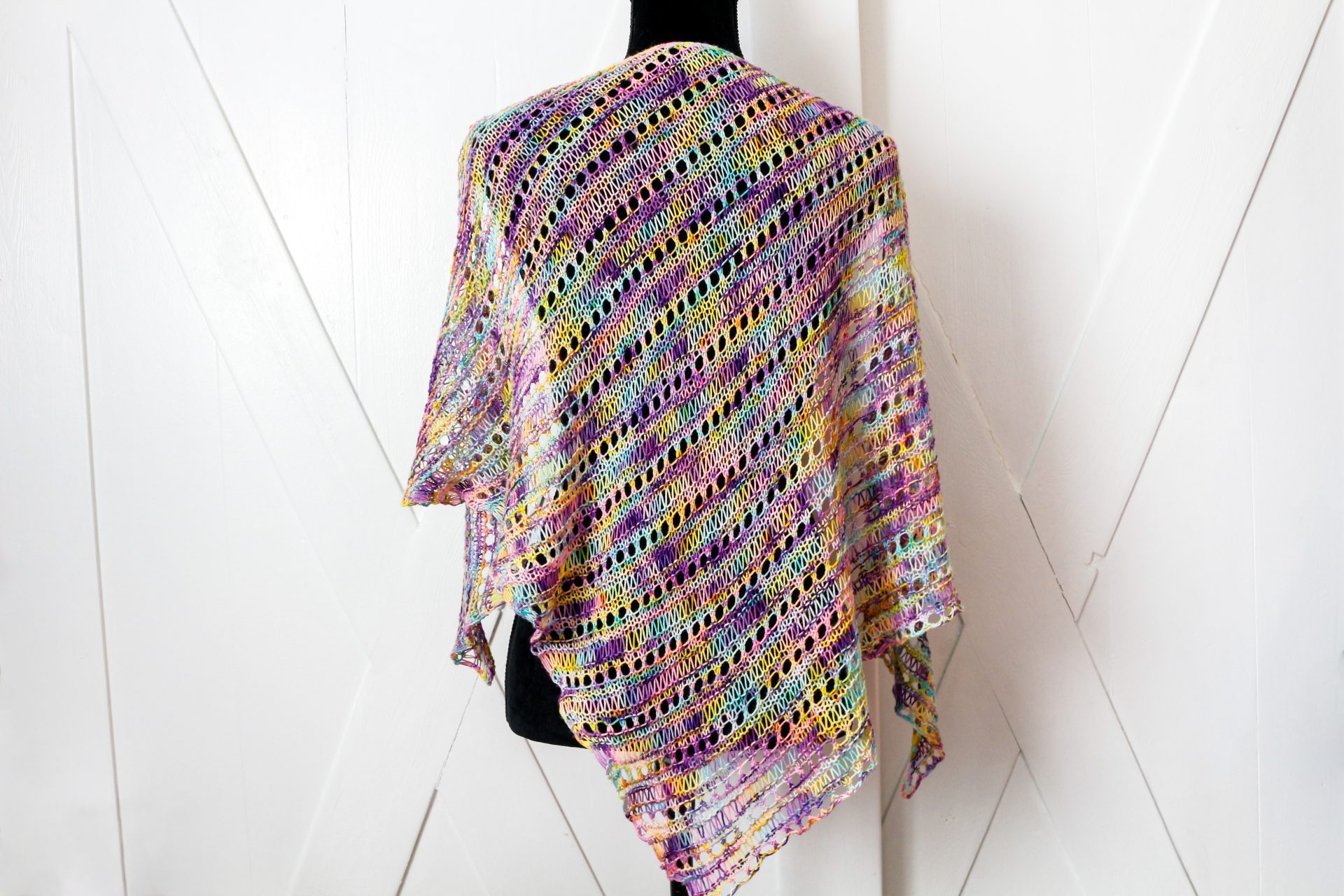 Mix Tape focuses on two triangular shawl shapes with the same pattern stitch! Side A features a triangle thatโs worked sideways along the bias. With three stitches added every four rows, it grows steadily, creating a beautifully flowing shape. The result is a lush, elegant accessory with effortless drape and movement.