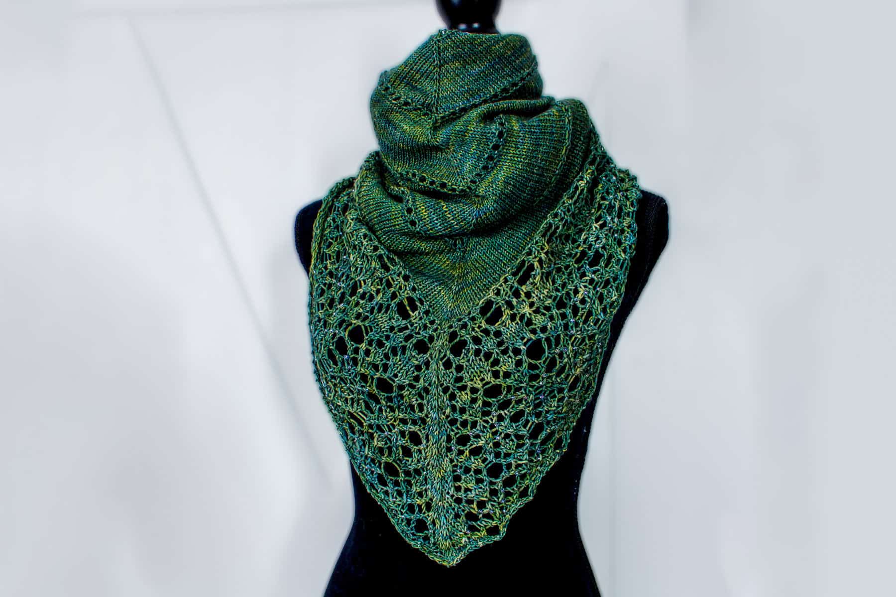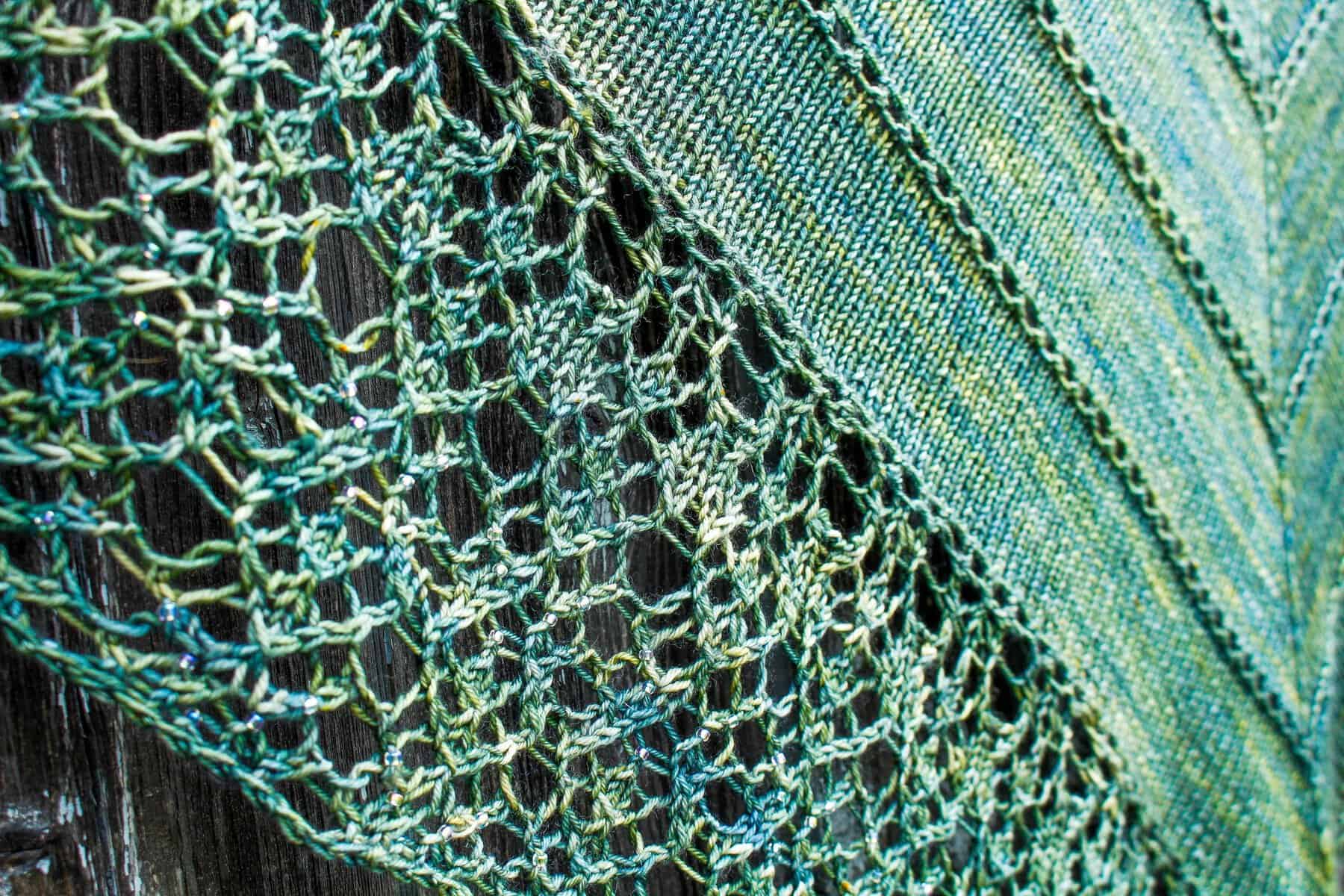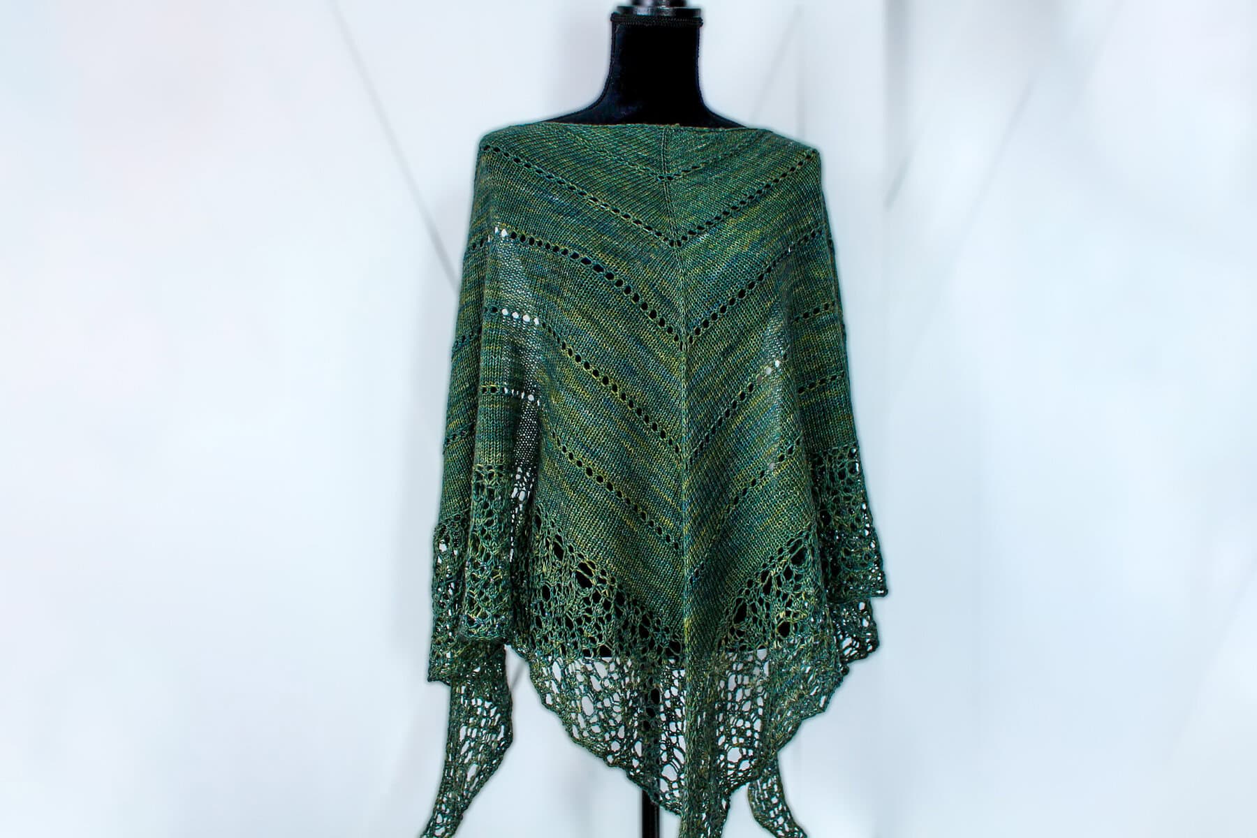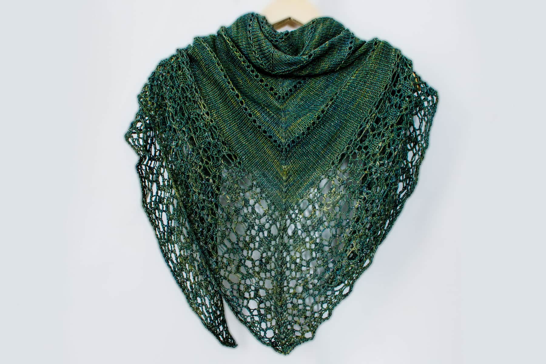 47.75 [84, 113.5]” / 121.5 [213.5, 288.5] cm across the wingspan, 18.25 [32, 43.25]” / 46.5 [81.5, 110] cm deep, after blocking. The pattern sample is shown in medium size.