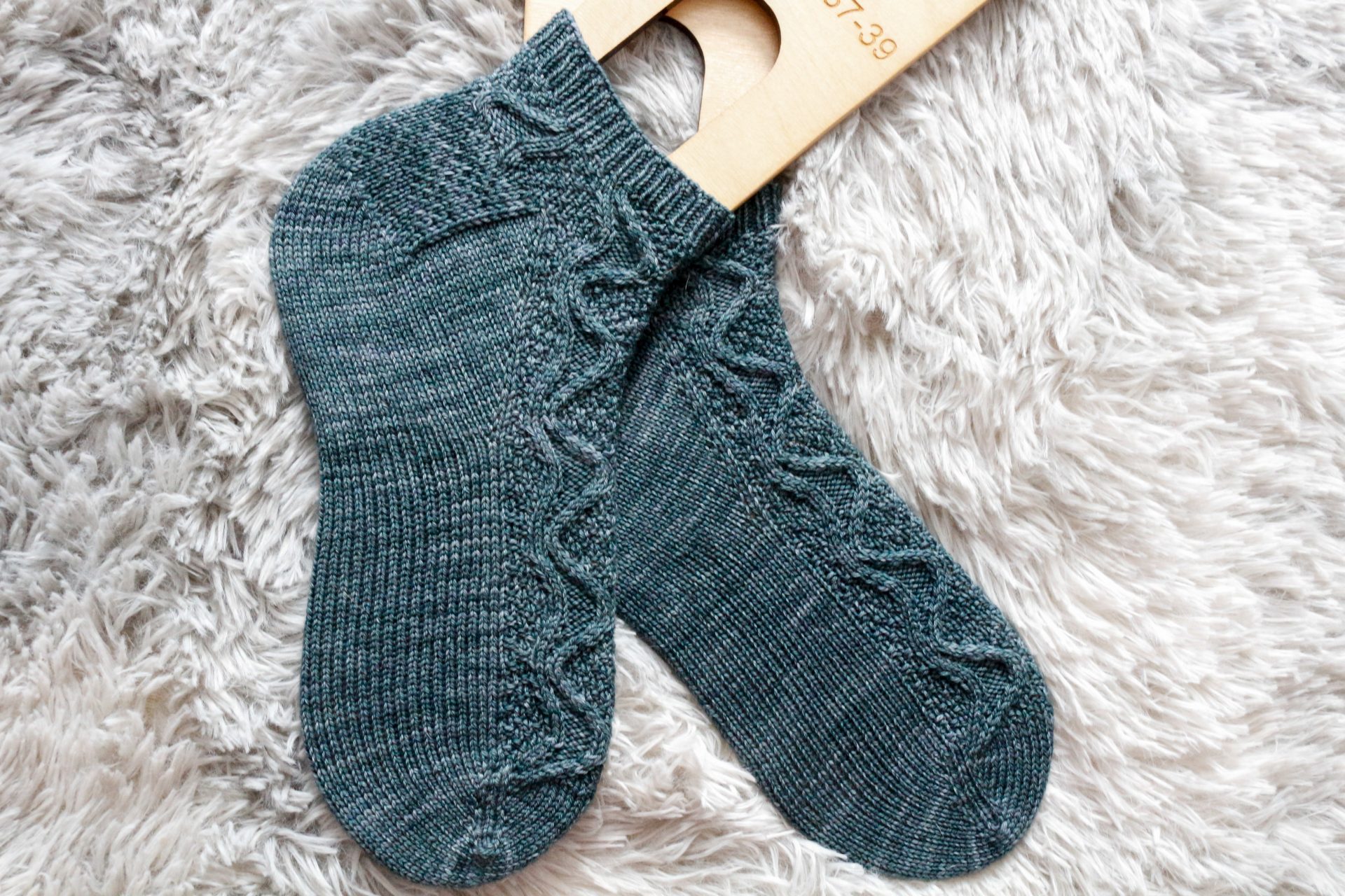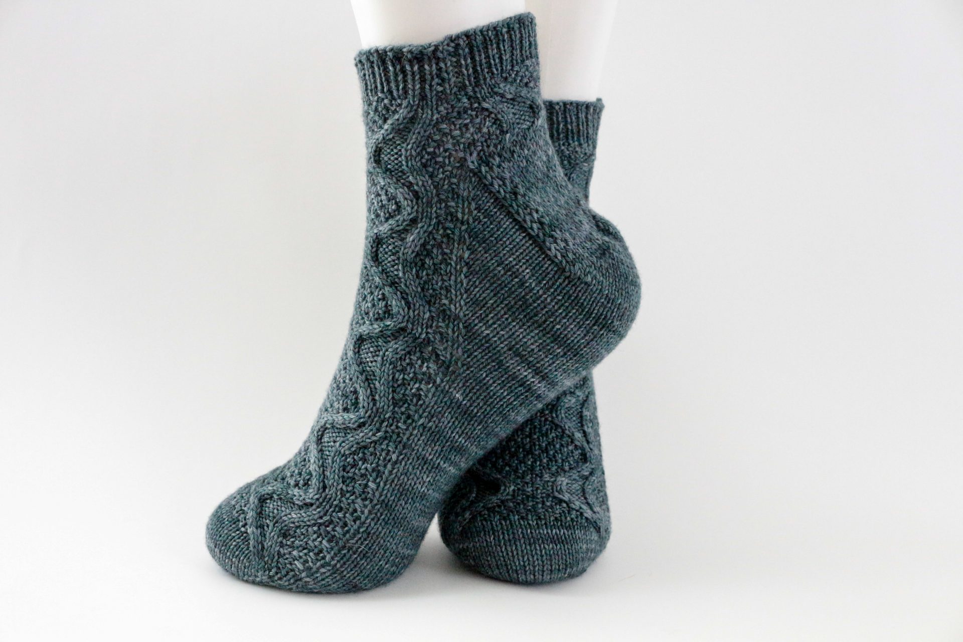 7 [7.5, 8, 8.5, 9, 9.5, 10, 10.5]” / 18 [19, 20.5, 21.5, 23, 24, 25.5, 26.5] cm circumference — select a size from the finished measurements that is 1-1.5” / 2.5-4 cm smaller than your foot circumference. These socks are worn with negative ease. We made the sample pair from the toe-up directions in Size 2.