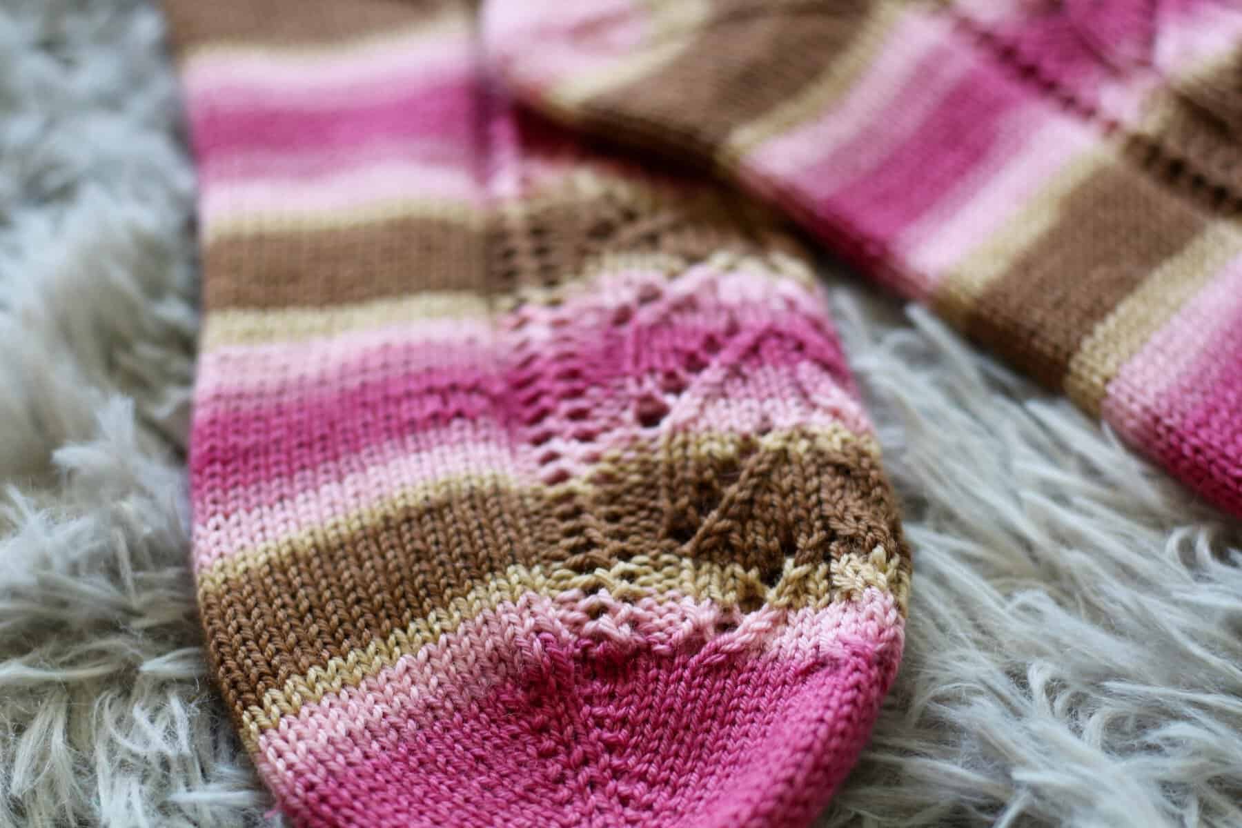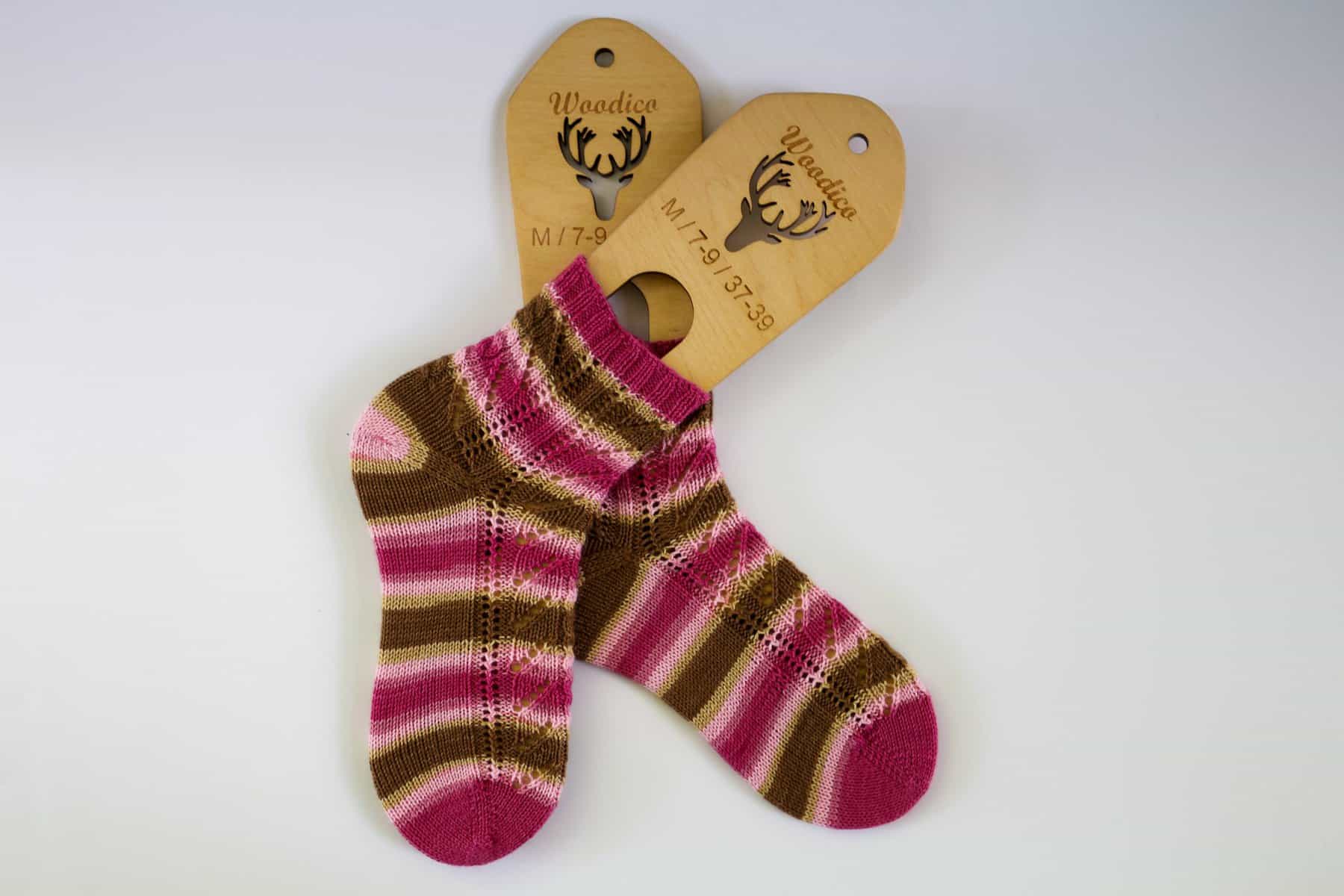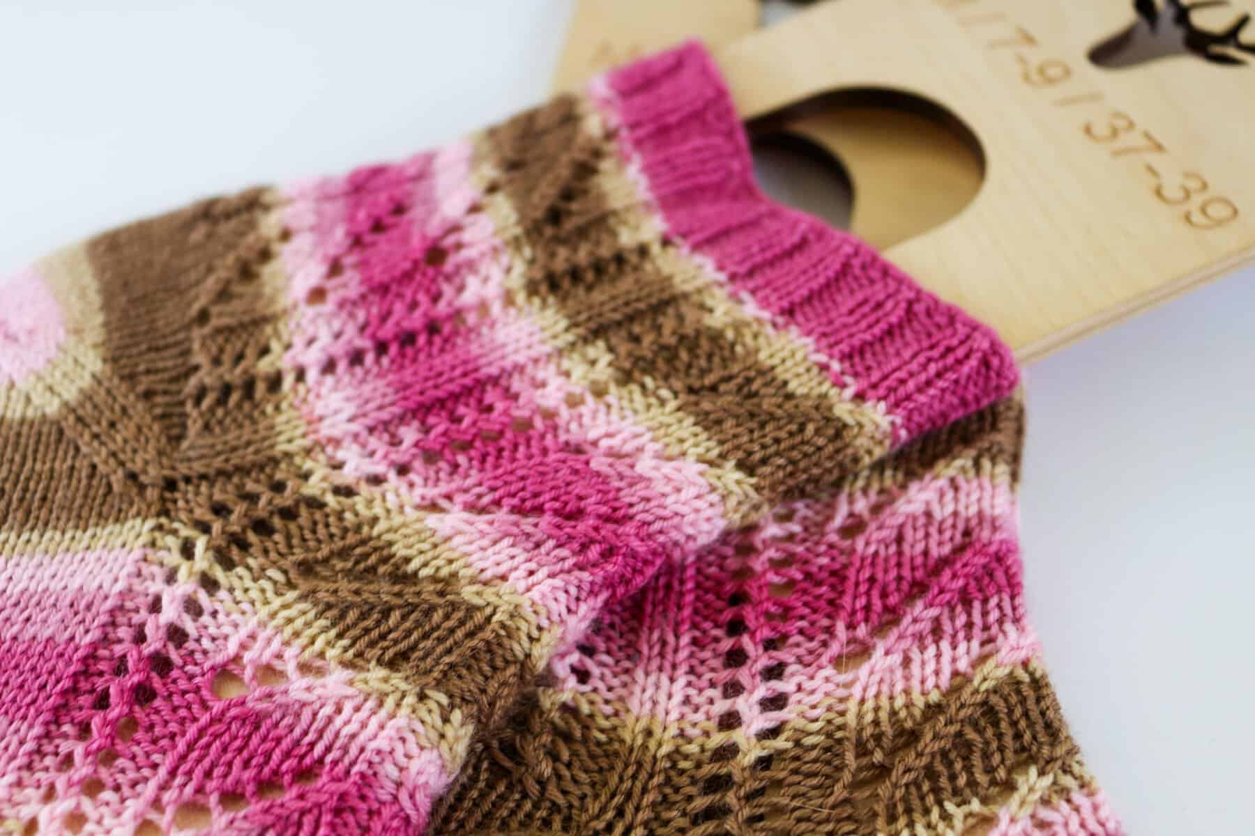 32 stitches by 40 rounds in stockinette = 4โ / 10 cm, after blocking. Gauge is crucial in obtaining the correct fit. Changes in gauge will cause a size difference for your finished socks.