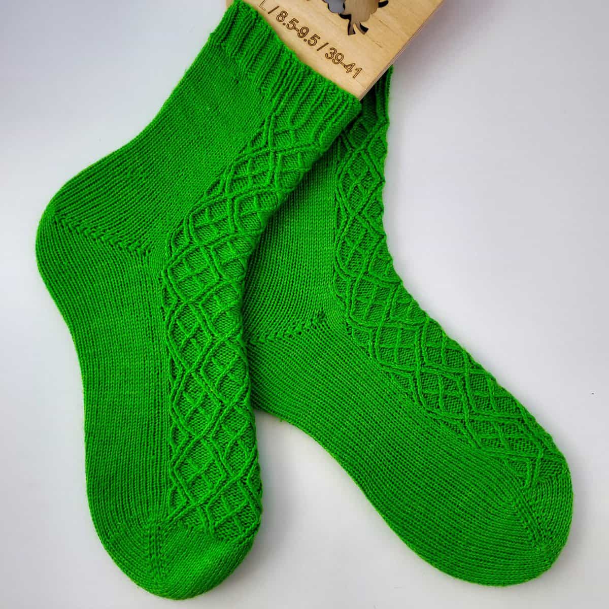32 stitches by 40 rounds in stockinette = 4โ / 10 cm, after blocking. Gauge is crucial in obtaining the correct fit. Changes in gauge will result in a size difference for your finished socks.