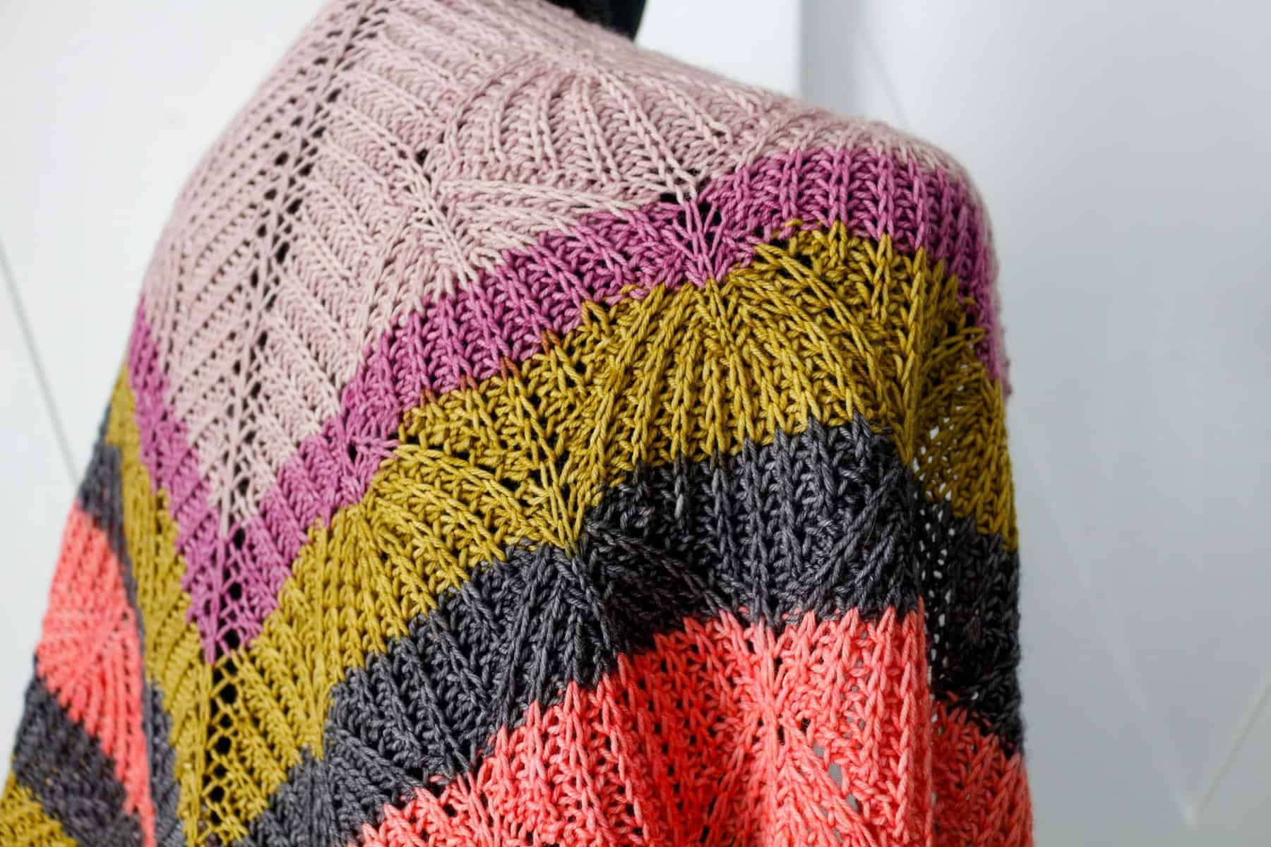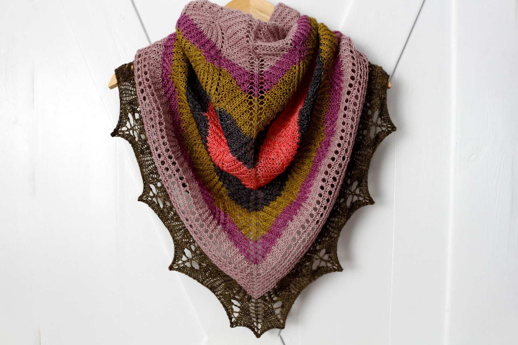 49.75 [72,ย 94.25]โ / 126.5 [183, 239.5] cm across the wingspan, 24.75 [36, 47.25]โ / 63 [91.5, 120] cm deep, after blocking. The pattern sample is shown in medium size.