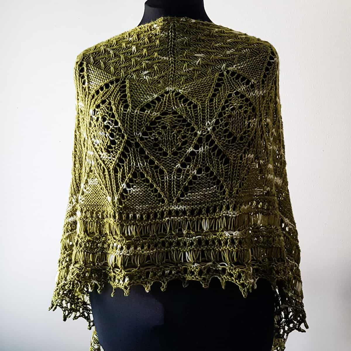 Approximately 78 [107]โ / 198 [272] cm across the wingspan, 25 [34]โ / 63.5 [86] cm deep, after blocking. Pattern sample is shown in the smallest size.