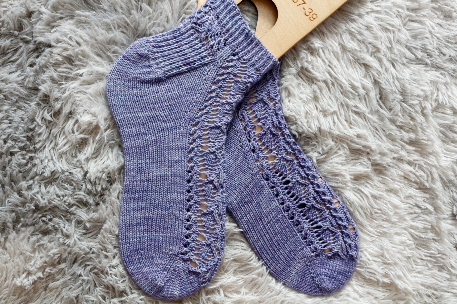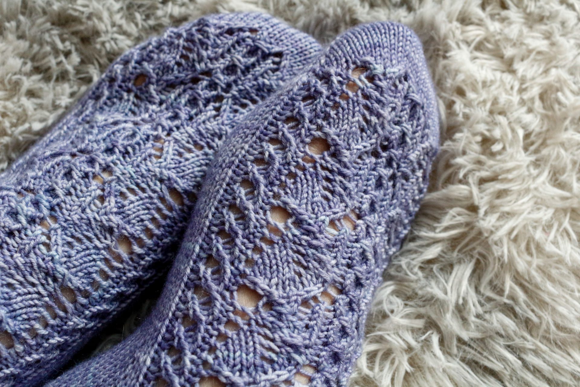7.5 [8, 8.5, 9, 9.5, 10, 10.5, 11]” / 19 [20.5, 21.5, 23, 24, 25.5, 26.5, 28] cm circumference — select a size from the finished measurements that is 1-1.5” / 2.5-4 cm smaller than your foot circumference. These socks are worn with negative ease. We made the sample pair from the toe-up directions in Size 2.