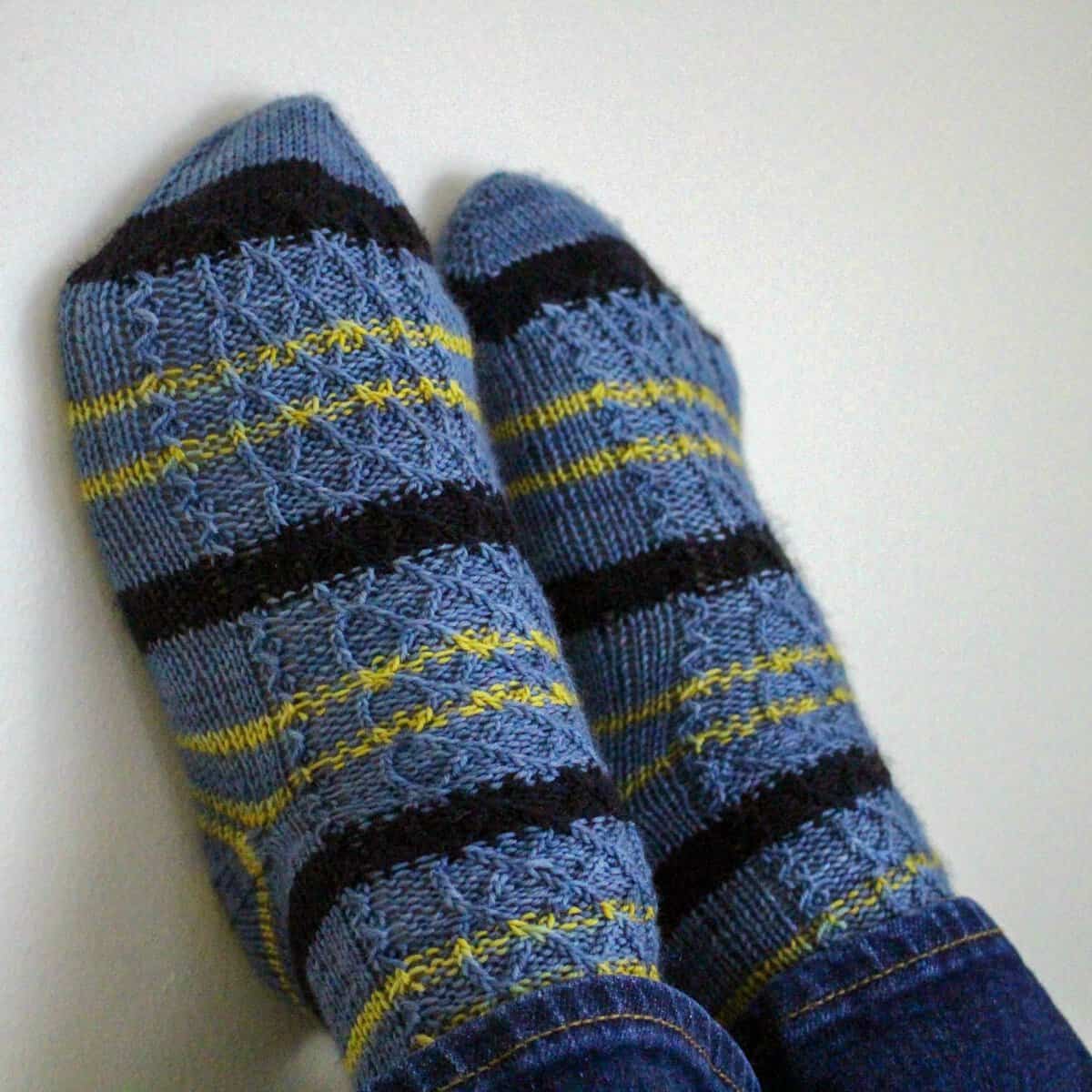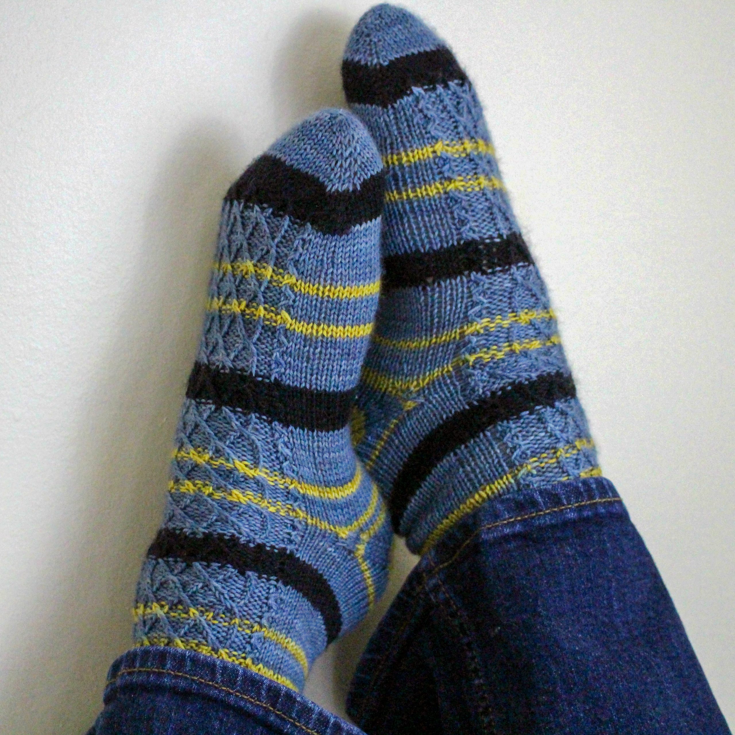 32 stitches by 40 rounds in stockinette = 4โ / 10 cm, after blocking. Gauge is crucial in obtaining the correct fit. Changes in gauge will cause a size difference for your finished socks.